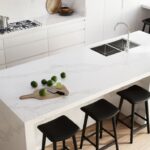 ShowroomsA symphony of wide, elegant, cascading grey veins on an opaque creamy white base, inspired by the rich beauty of natural Italian Calacatta marble.