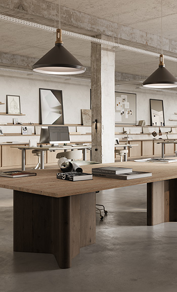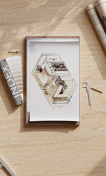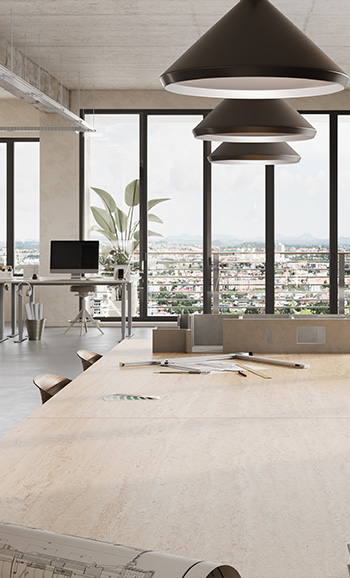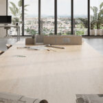 In-Sync Technology creates seamless design continuity across body, surface, and edge, by blending pure raw minerals of varying grain sizes into each porcelain slab.
