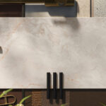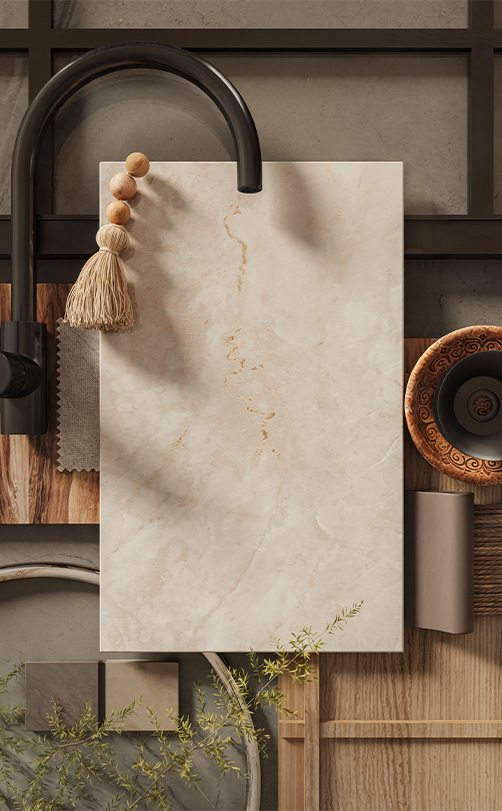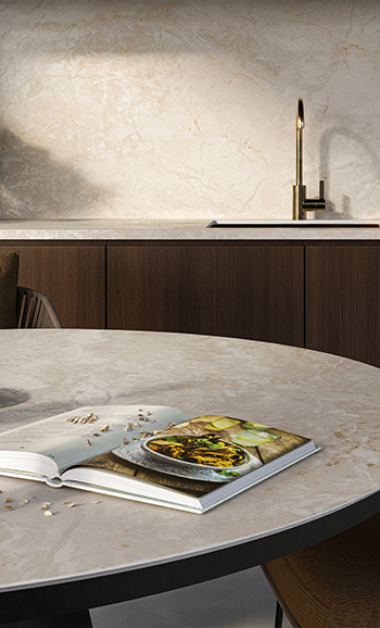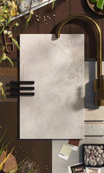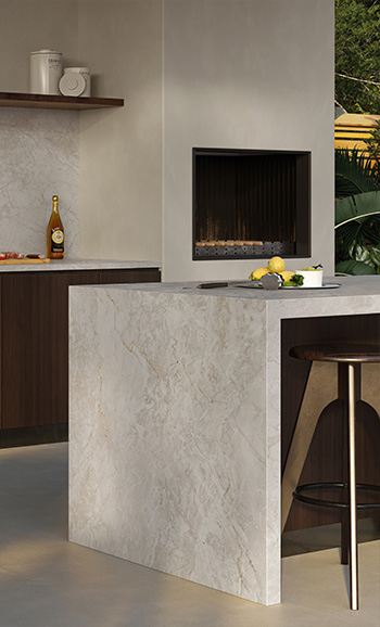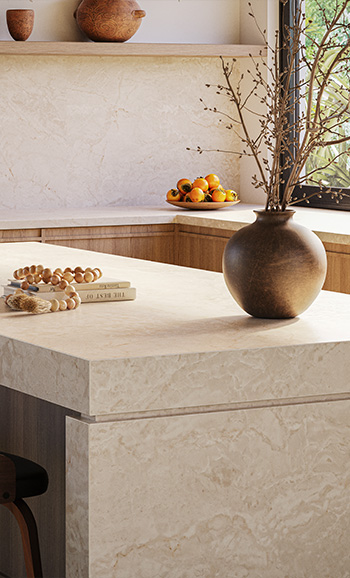 Crestone is quietly luxurious: a creamy taupe base swept with beige, earthy grey, white, and coppered veins. Gentle movement and natural authenticity give this surface its refined depth.