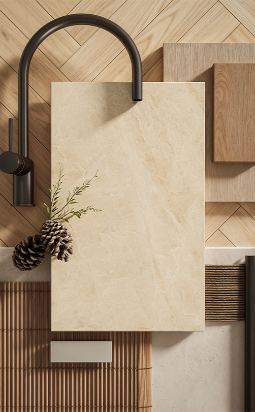 Opal Taj’s soft taupe, beige, brown and creamy-white veining creates an elegant earthy patina. Its velvety matte finish exudes quiet sophistication and pared-back luxury.