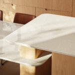 A delicate mesh of streaks and speckles wrap this cream-coloured surface, traversing it in a crossway of elegant ashen shades.