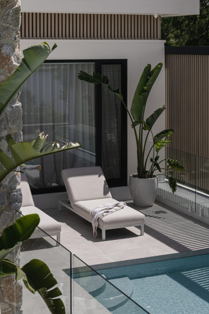 The vision was clear, to create a home that looks effortless, feels welcoming, and doesn’t demand constant upkeep. Mid-century lines and Palm Springs nostalgia are softened through timber, concrete, and warm white tones. High ceilings and courtyards pull in natural light, while big panes of glass connect living areas to the outdoors. The result is a home that feels generous but not showy.