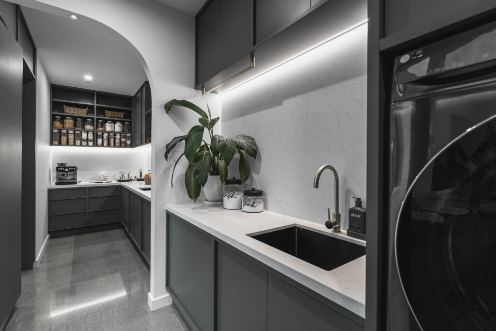 Dreamy Carrara™, from the Caesarstone® ICON™ Advanced Mineral Surfaces Collection, brings a sense of calm to the busiest parts of the home. Its soft white base and gentle veining brighten the laundry, butler’s pantry, and even the living room’s TV unit, carrying that same elegance throughout.