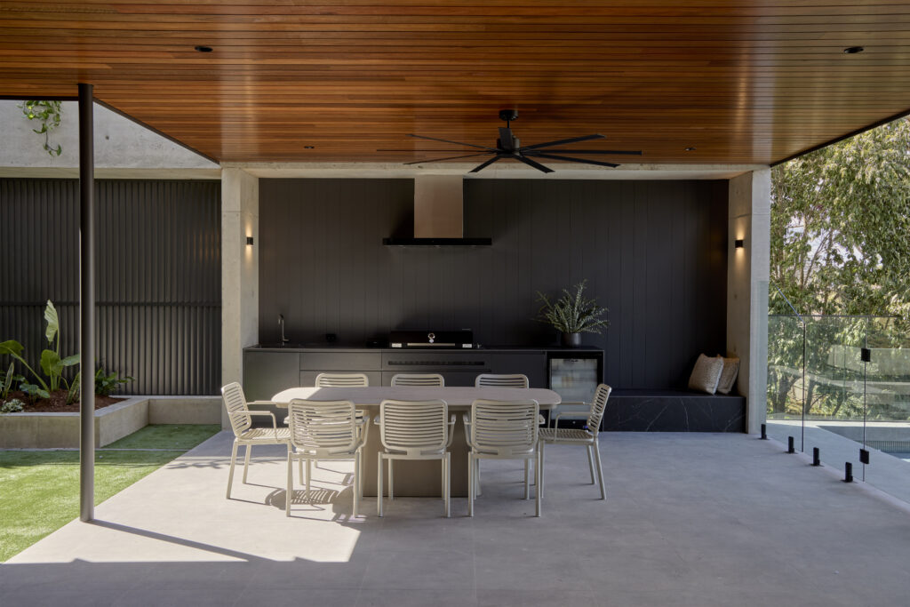 Caesarstone® Porcelain Smokestone is used across the island benchtop, splashback and other key surfaces, chosen for its depth and visual energy. With its midnight-black base and chalk-white calcite veining, Smokestone introduces movement and character, creating a strong focal point within the open-plan layout. The Ultra Rough finish enhances its tactile quality, reinforcing the kitchen’s bold yet refined presence.