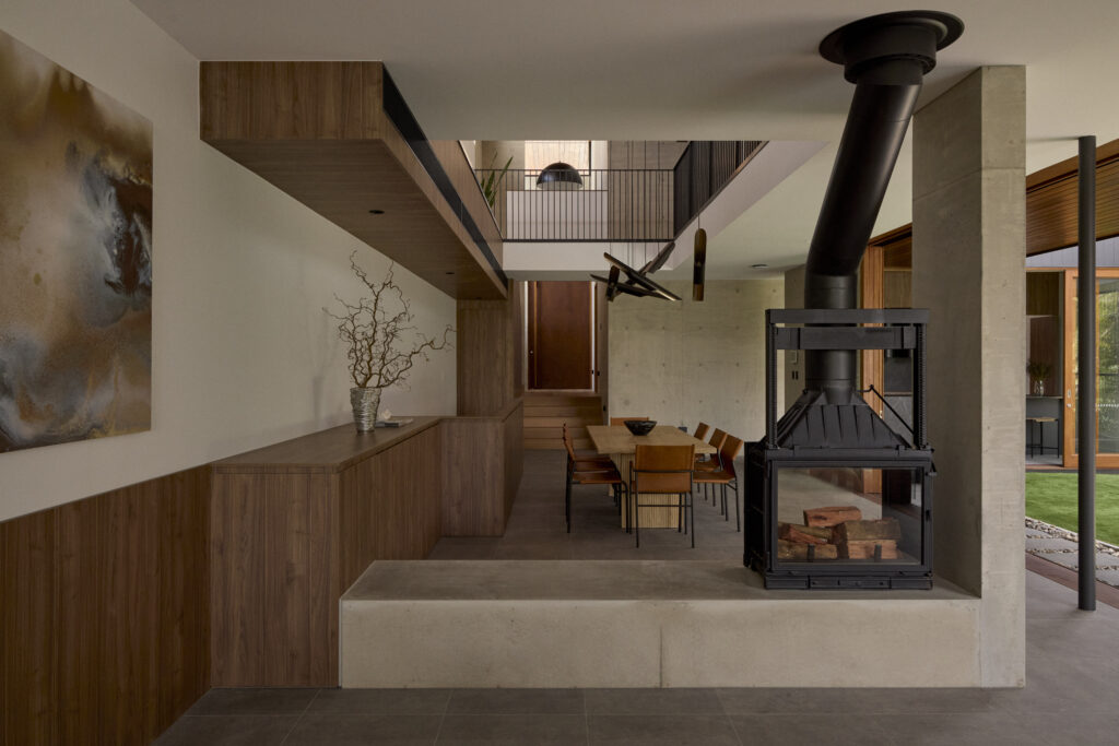 The kitchen sits at the centre of the home, where volume and materiality work in harmony. Four-metre ceilings give the space breathing room, allowing darker surfaces to feel expansive rather than heavy.
