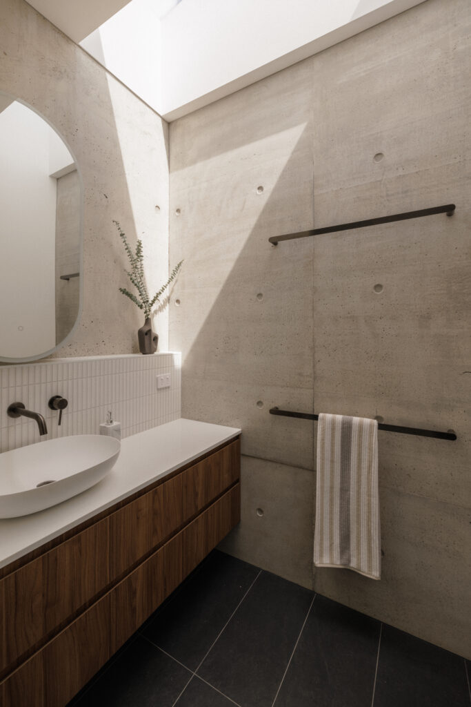 Paired with black and walnut joinery, off-form concrete walls and brushed gunmetal fixtures, the palette feels cohesive and intentional. Each element amplifies the next, with the porcelain surface anchoring the space while responding beautifully to changing light throughout the day.