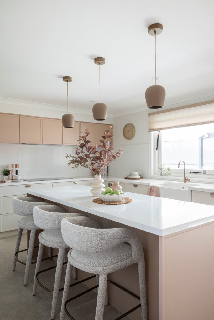 Key to the success of this kitchen is its beautiful colour scheme – inspired by the warm- terracotta splashback tiles (with blush undertones), the palette is one of soft, blush hues with warm, earthy tones.