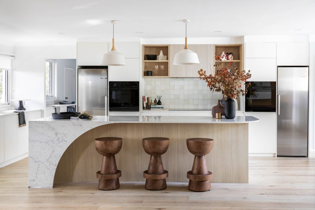 The completed kitchen has at its heart a sculptural island bench, featuring sweeping curves clad in beautiful Caesarstone® ICON™ Arabetto™ and a mellow, understated timber cladding. Contrasting timber stools serve to highlight the rich textural elements of the overall bench and provide a second focal point.